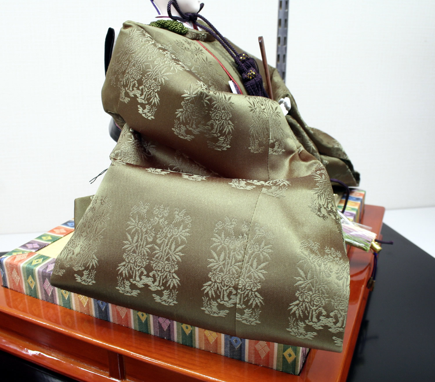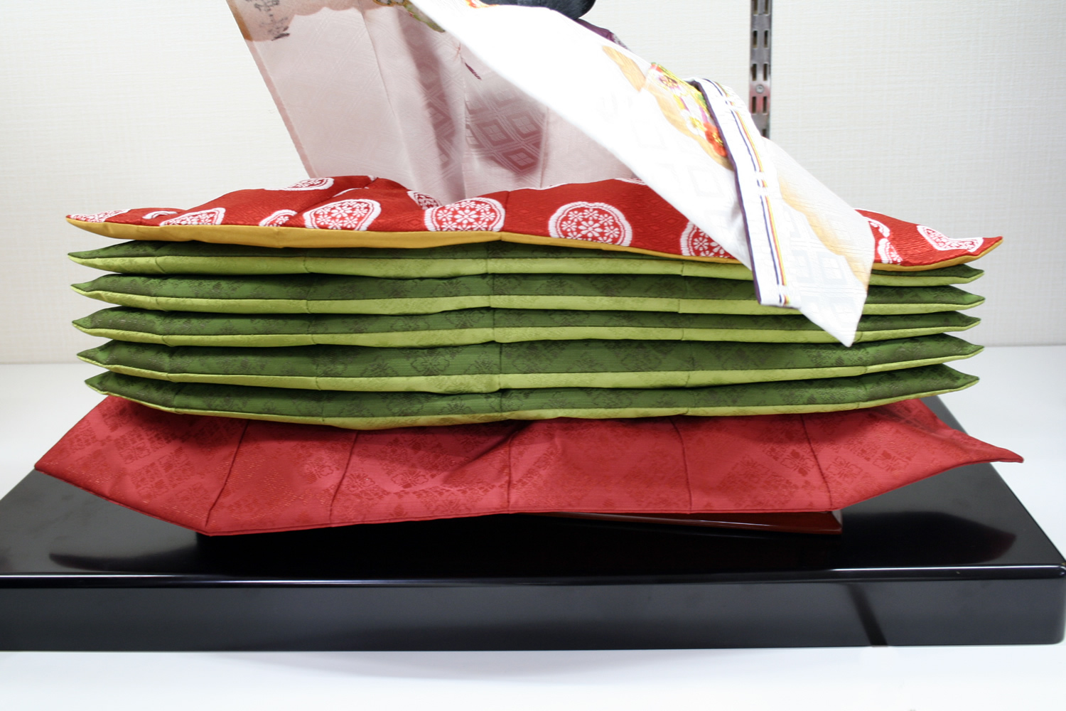 最高級本着付けの雛人形の伝統技法で、実際にお着物の一枚一枚を丹精込めて着せ付けており、袖の中の五衣(いつぎぬ)も裏までしっかり縫い合わせ袖口の奥まできれいに着せています。布地で作る姫衣装は、すべて本着せタイプです。当店のお人形はほぼ本着せで作り上げています。