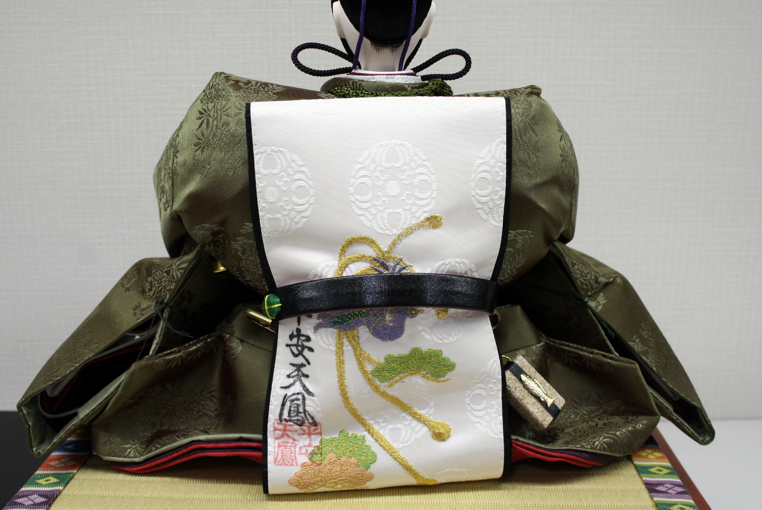 | 最高級本着せ技法を使用した伝統工芸士平安天鳳の自信作。天皇家に伝わる色柄の装束の人形は丹精込めたつくりで定評があり華麗さと品を表します。 | 作:伝統芸師 平安天鳳 サイズ:145cm×105cm×120cm (間口×奥行×高さ) |